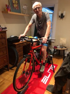 I’ve been training since September with my trainer Jean-Luc Mejane. I think of him as my very own personal Torquemada, the infamous Inquisition torturer. He has me doing things that I was certain would finish me off. Miraculously, I survived but after each ordeal he would devise fiendish new experiments on my body and sanity. Here’s a picture of me on my bike trainer. (It’s winter here in Canada so I’m doing all my riding indoors.)