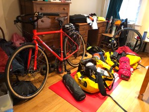 Now it’s the final push but the main thing is supplies and packing. Every time I think I have it all together I remember something else I must absolutely have. It’s all got to fit into two duffel bags: tent, sleeping bag, mattress, pillow, lights, bicycle spare parts, cycling gear for months of long days on dusty roads, etc. This is what my prep room looks like.