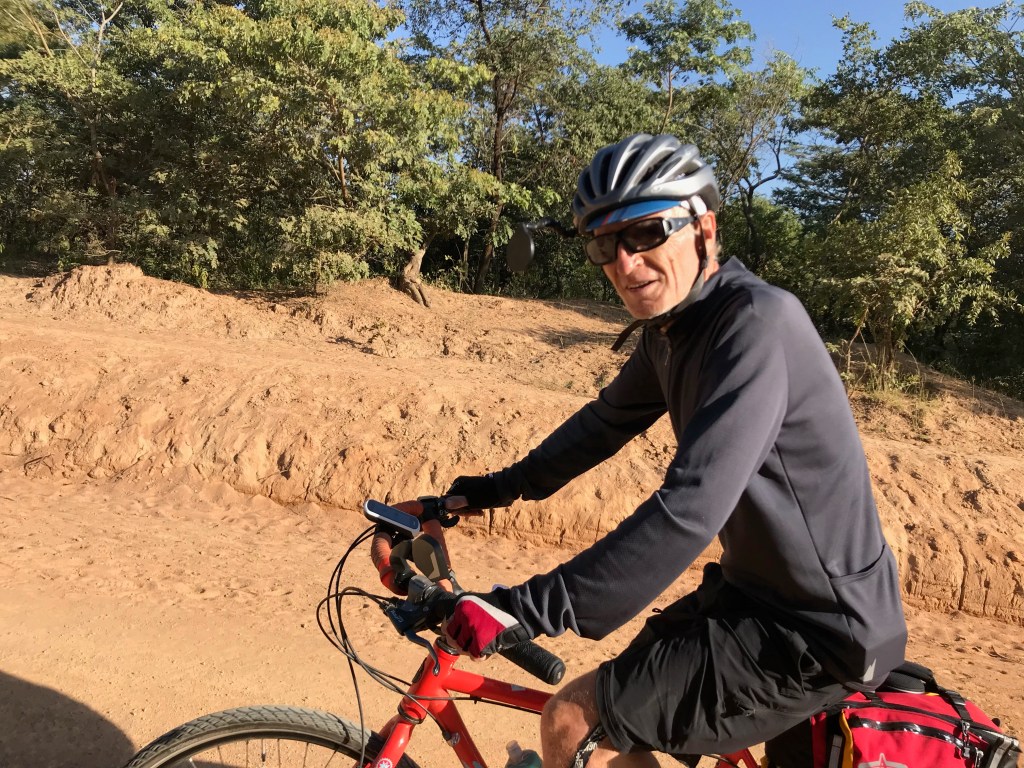On the fourth day, I lost it; it was the third day of the rough roads. I had struggled through and on that day had passed the 90 km mark when we came to a stretch of deep, soft, impenetrable sand that seemed to go on for kilometer after kilometer. I dragged the bike, tried to remount, fell, dragged, remounted only to fall again. I was also dead tired having had a bad night, waking at 2 am and unable to get back to sleep. I thought there is no way through this. I threw my bike down swearing at the top of my lungs. A little while later the van came by and I hopped on.