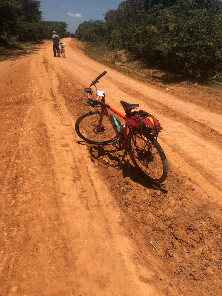 My comeuppance came a couple of days later. We had left paved roads behind and were on dirt and gravel roads, which seemed each day to become progressively worse, shifting from washboard corrugations to loose, flinty stones, to buckled, eroding mixtures of sand, rock and concrete. I had no experience with these kind of roads; I had ridden gravel but that gravel was like silk compared to what I was now experiencing. It was a contrast too with the lush, verdant countryside of small holdings of maize and groundnuts and wild bush.