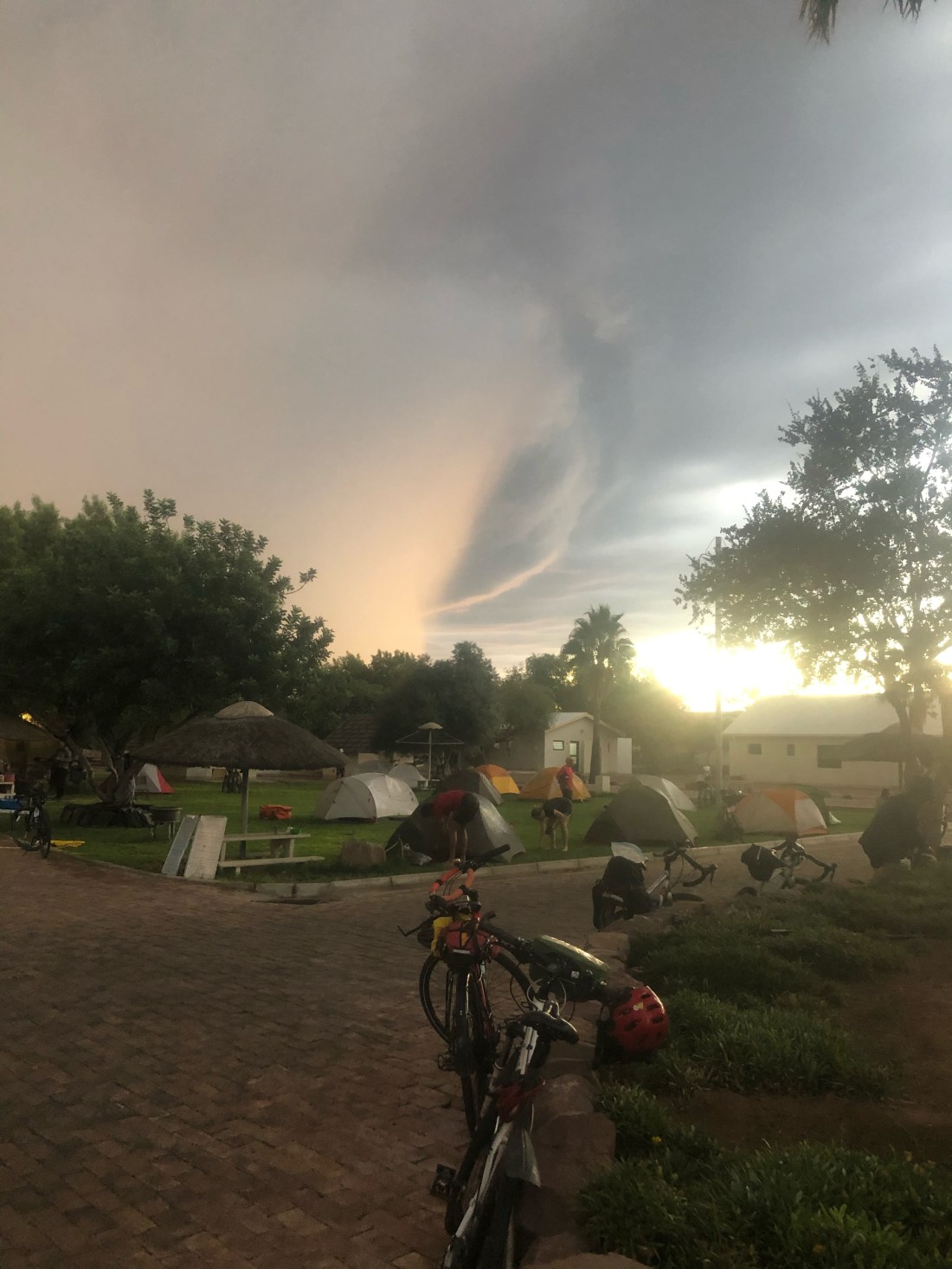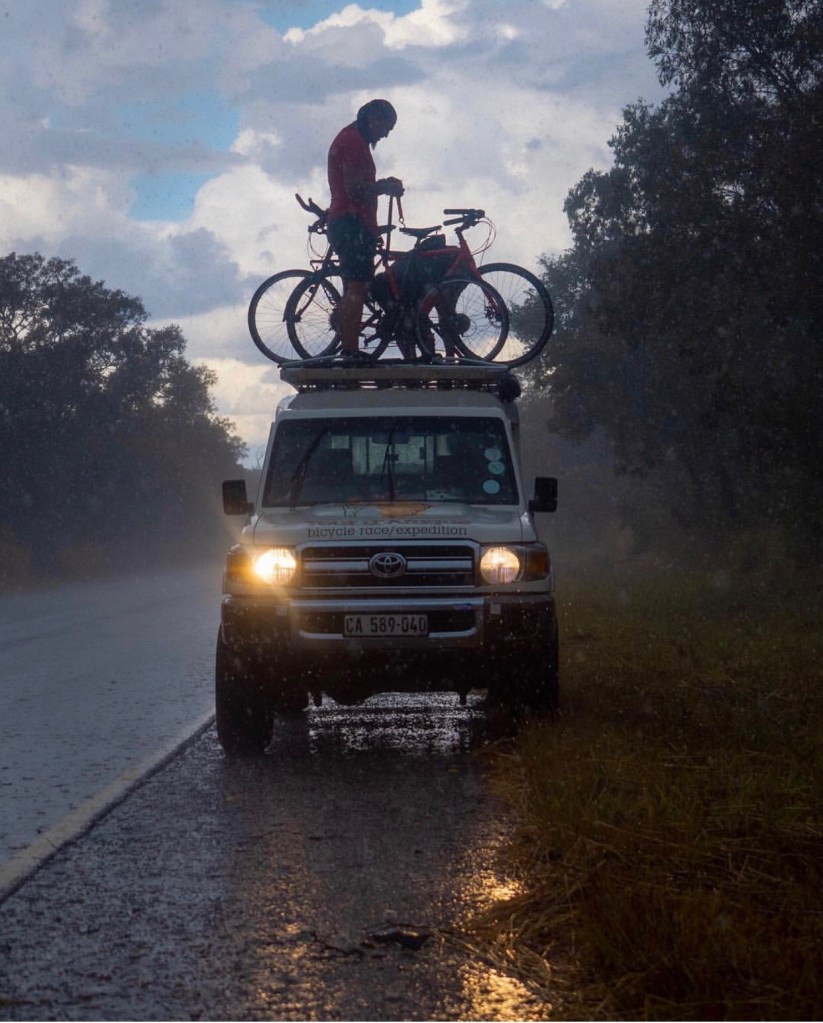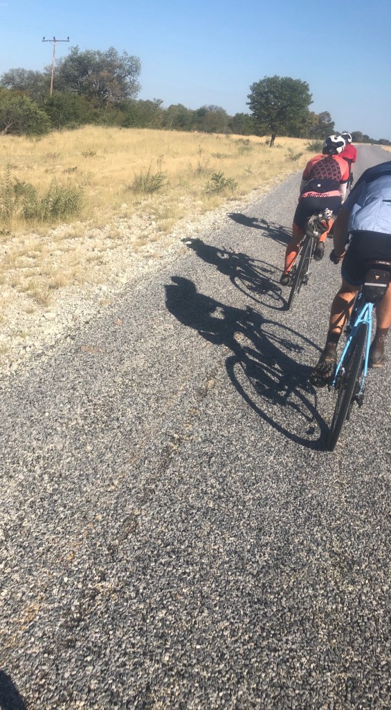 It was the day after “208”, the longest ride of the Tour. We were facing 162 kilometers, long enough but we were happy for the 40+ kms shaved off the previous day’s ride. The early morning was cold, the air grey and heavy with a dense mist. Some way along I caught up with a group of four riding single file in a peloton along the narrow margin of the Trans Kalahari Highway.