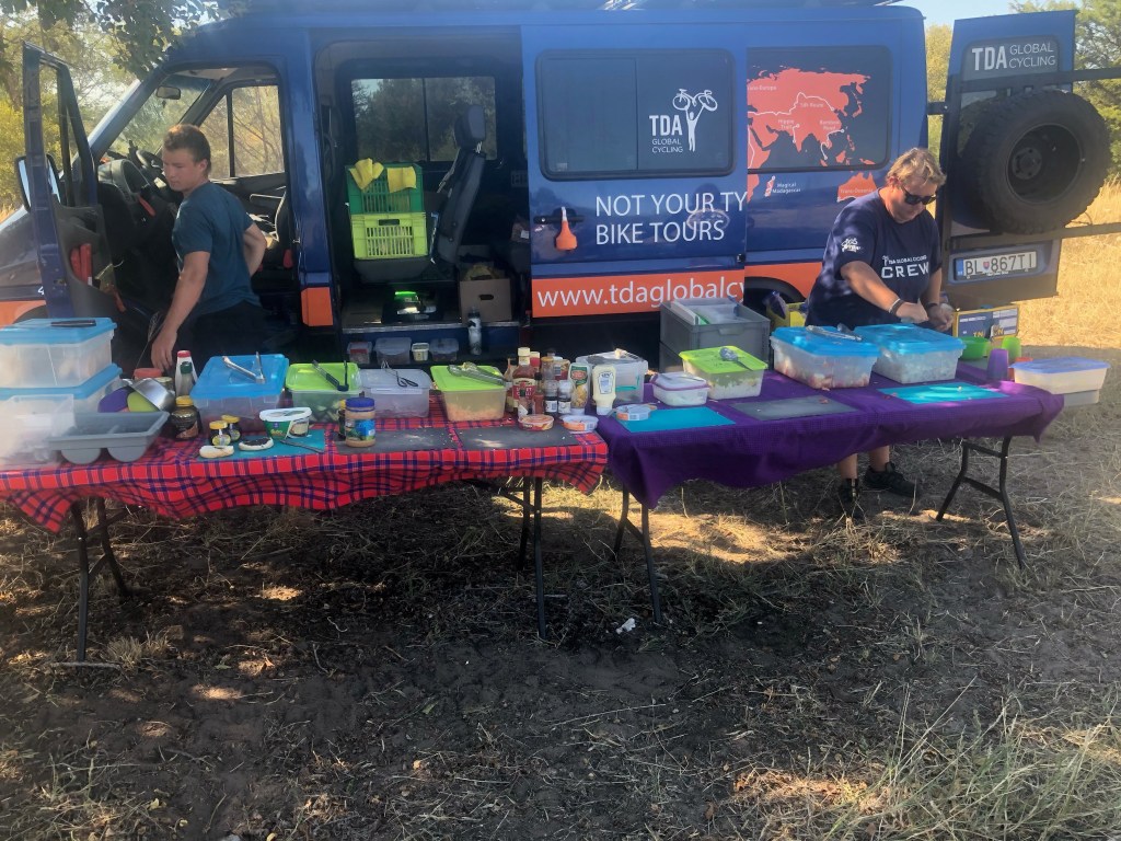 A couple of weeks ago, it struck me what slow means. I had for once decided to start my cycling day at lunch. The lunch truck leaves camp at about 6:00 in the morning. Within the hour, Lulu, our lunch maestro, has set up at the pre-determined kilometrage (that particular day it was at 75 kms on a 152 km day). The cruiser’s rooftop awning has been unfurled, chairs and tables laid out, food preparation underway. By 8:30 or 9:00 the first of the riders begin to arrive. (Lunch time is on a different schedule on Tour.) These are our elite group.
