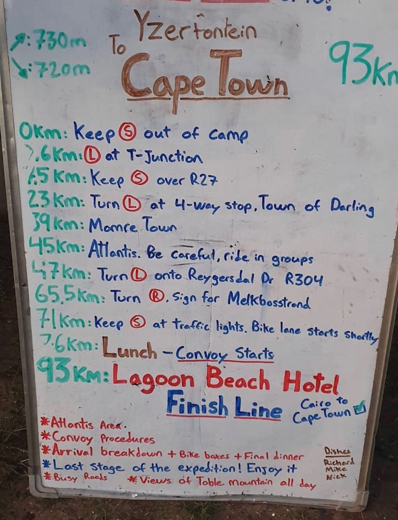 I became superstitious; we still faced six days of arduous cycling. Anything could happen between now and then to hinder that final, triumphant entry into Cape Town. I noticed how it cropped up in our conversations. Many of us repeating a variant of the mantra, “I need to be able to ride into Cape Town”, as if that ultimate prize could be snatched from us when it was within our grasp. I could feel, even on the last day, how I rode with bated breath as if everything that had come before would be undone if for some reason I had to climb in the van for the last kilometers.